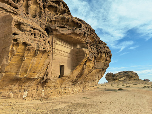 在埃尔奥拉,比大象岩更为神秘更具历史厚重感的是黑格拉,这里是两千多年前纳巴泰王国南境的首都,也是一座规模宏大的岩石墓城。上百座气势恢宏的岩石被精心切割、雕琢成墓穴,其正面镶嵌着繁复精美的纳巴泰风格装饰:阶梯状的冠顶巍峨壮观,盘旋的埃及风格蛇饰灵动神秘,振翅的雄鹰气势磅礴,带翅膀的神像庄严神圣……除了墓穴,散落的遗迹还包括水利系统、防御工事残