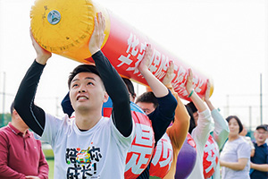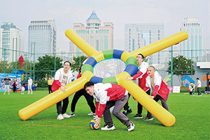 在“夺宝奇兵”项目,选手们似离弦之箭般飞驰而出,每一次跨越障碍,都是全力以赴的冲刺,每一次击掌交接,都传递着华安团队的默契与信任;“罗马炮架”是对精准度与默契度的双重考验,各队队员分工协作、各司其职,瞄准、投掷、指挥一气呵成,只为在有限时间内投进更多有效球;在“携手并进”项目中,各队队员紧密协作,稳稳托举起印有“华安保险与您共成长”“做一家受人尊敬的保险企业”“责任 专业 奋进”标语的巨型气
